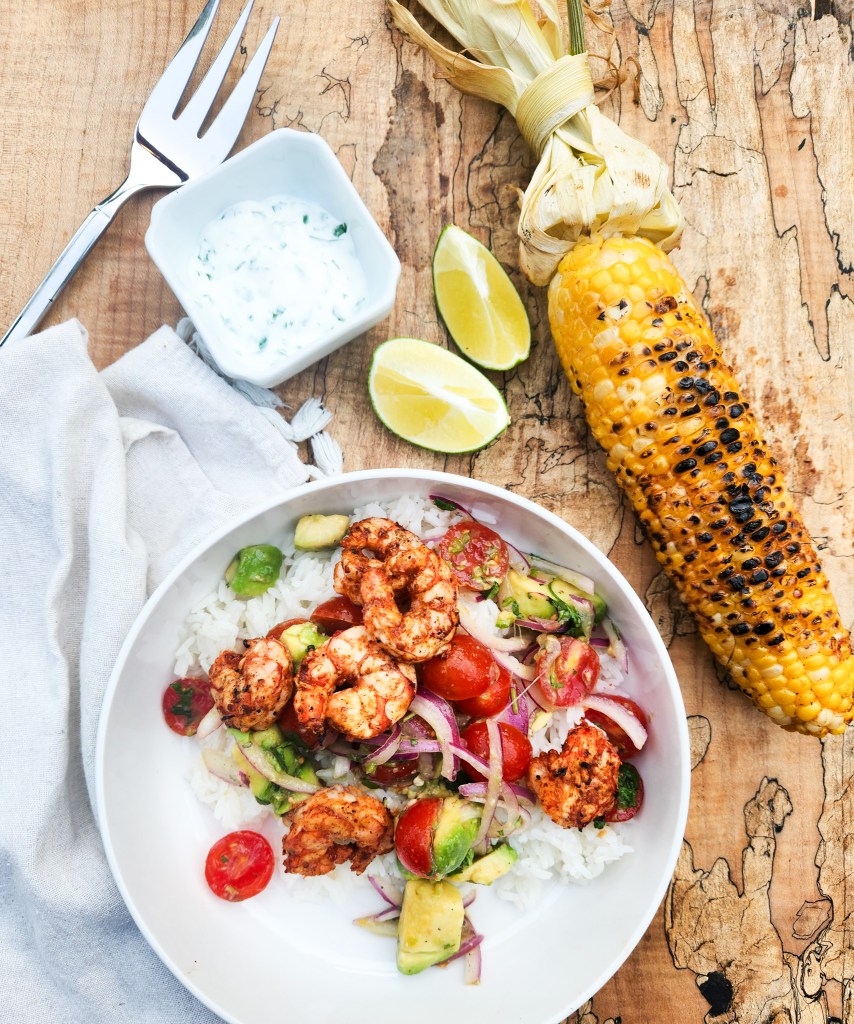 Mexican Grilled Shrimp Bowls with tomato avocado salsa, grilled corn and cilantro lime crema over fluffy white rice.