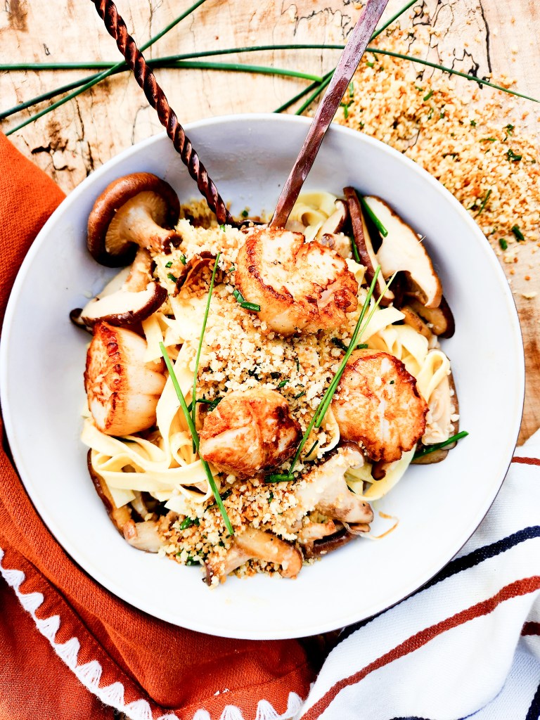 Mushrooms have so many nutrients. Whether you forage your own mushrooms or you grab what the market has, we have the best recipes to showcase these beauties. Mushroom Chive Pappardelle with portobello mushrooms and fresh chives in a light pan sauce with fresh pappardelle pasta. Perfect for a hearty vegetarian meal or anytime you want a simple pasta dish. Shiitake and Scallop Fettucine in a buttery garlic shallot sauce with crispy breadcrumbs, parmesan and fresh chives checks all the texture boxes. This is rustic elegance at its best. Chanterelle Sage Stuffing combines earthy chanterelle mushrooms, sage and leeks with toasted bread cubes for a really delicious side dish.