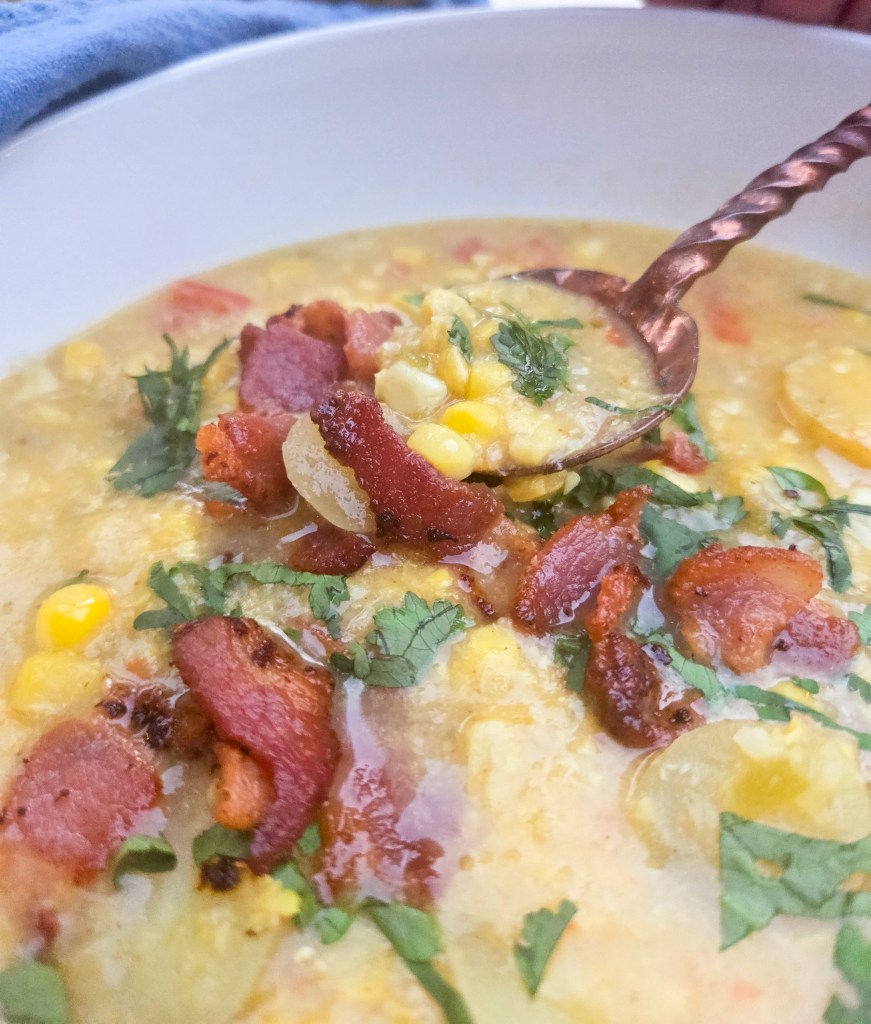 Corn chowder is creamy and bursting with bits of fresh corn, tender potatoes, cilantro and crispy bacon bits.